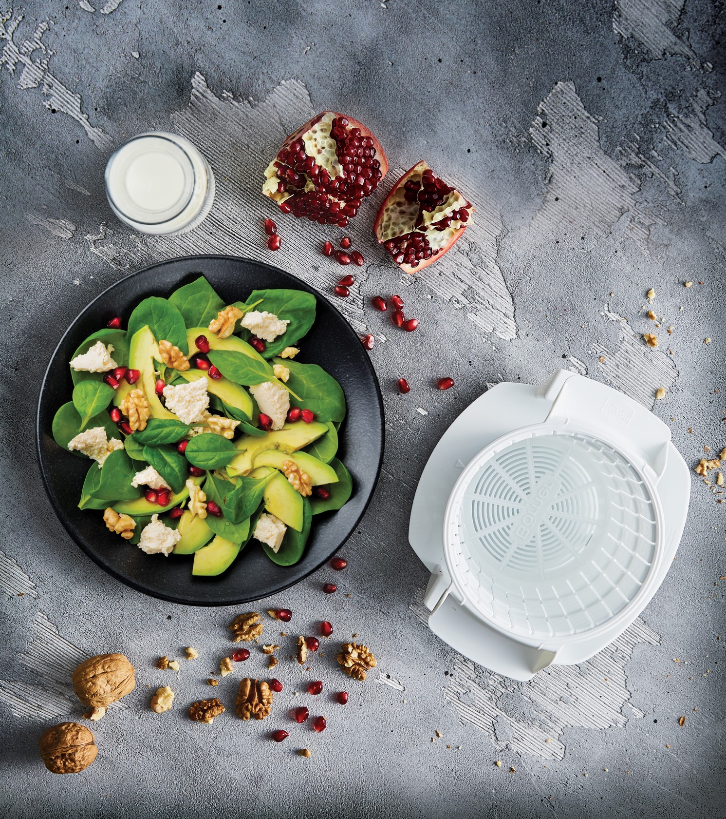 Der Börner Cheesemaker besteht aus einem hochwertigem Abtropfsieb aus widerstandsfähigem BPA freien Kunststoff. Ebenfalls im Lieferumfang enthalten ist der passgenaue Teller, der als Abtropfhilfe für Flüssigkeiten dient. Der Teller dient auch zum Servieren des zubereiteten Käses. Sowohl das Abtropfsieb als auch der Teller des Cheesemakers sind für die Reinigung in der Spülmaschine geeignet.